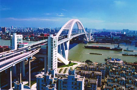 盧浦大橋為連接上海浦東與浦西的主要橋梁之一。全長8.7公里,是當(dāng)今世界第一鋼結(jié)構(gòu)拱橋,是世界跨度最大的拱形橋。由于采用一跨過江,主跨直徑達550米,被譽為”世界第一鋼拱橋“。大橋主橋為全鋼結(jié)構(gòu),大橋全長3900米,其中主橋長750米,寬28.75米。主橋按6車道設(shè)計,計算行車速度80公里/小時。